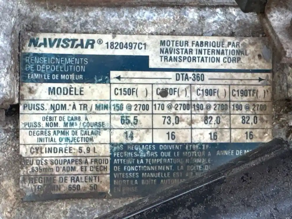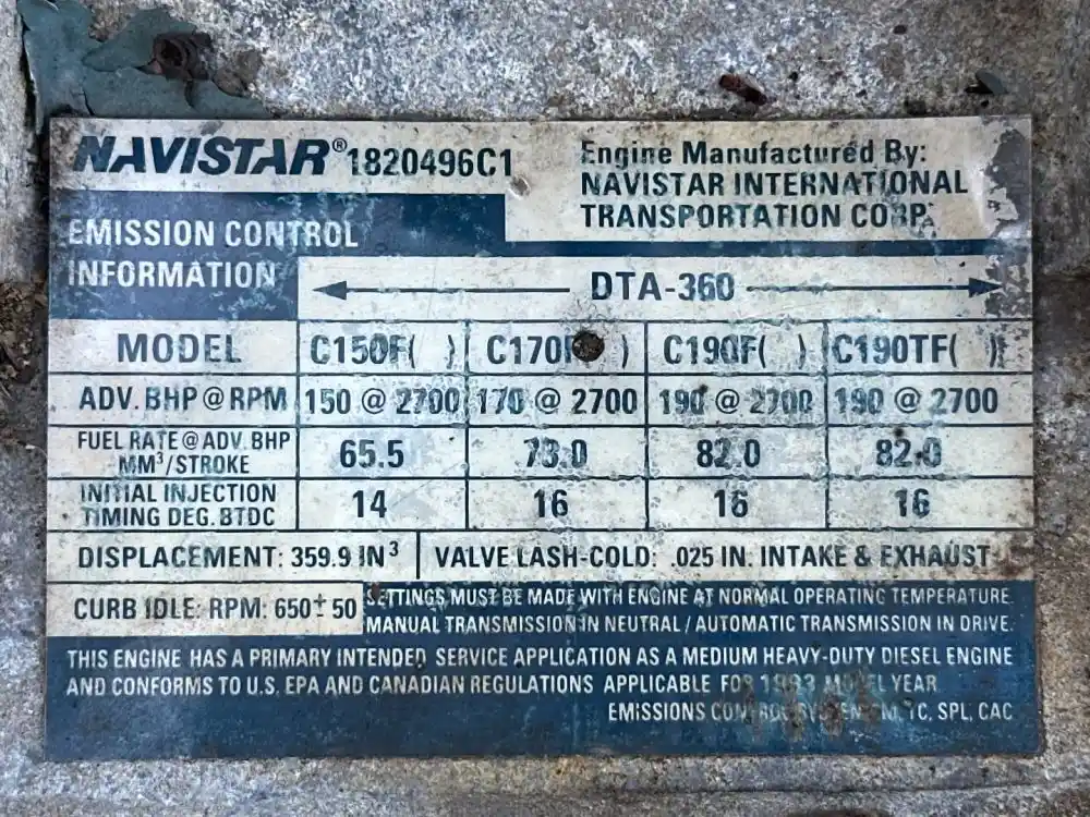 (Core) 1993 International DTA360, ENGINE ASSEMBLY- Displacement: 5.9 L, Horsepower: 170 HP, Part Number: 1820496C1, E.C.S.: TC, SPL, CAC, . ,