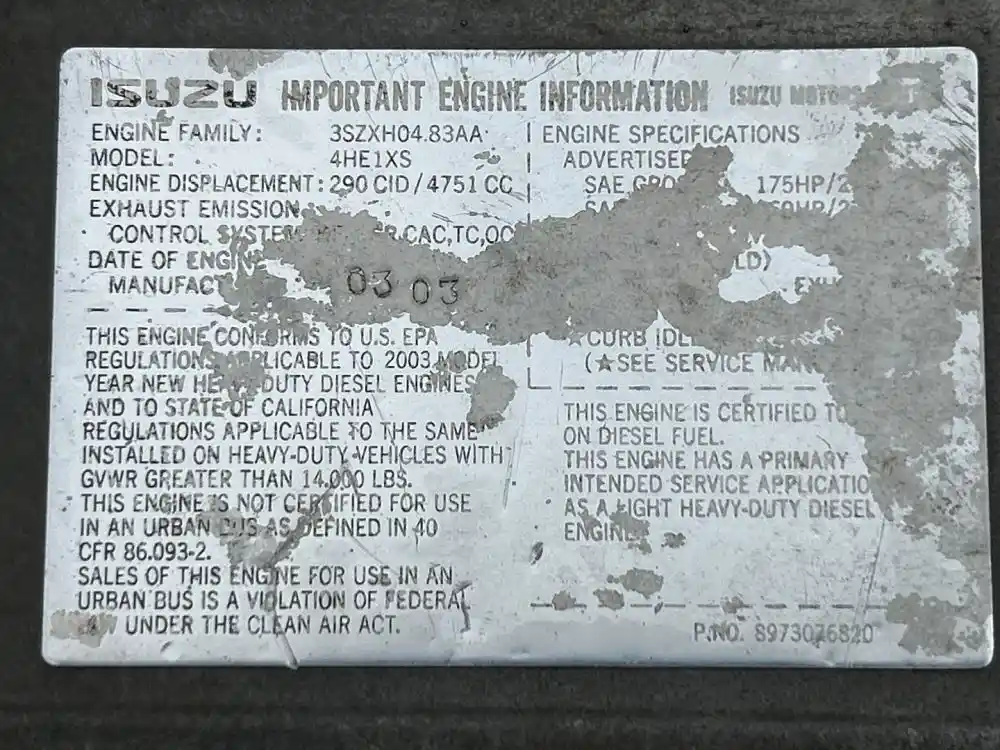 (Core) 2004 Isuzu 4HE1XS, ENGINE ASSEMBLY- Family Number: 3SZXH04.83AA Model: 4HE1XS Displacement: 4.83L, Horsepower: 175, Part Number: 8973076820, E.C.S.: CAC, TC, OC, Reference images for condition , - ARR/CPL: Other