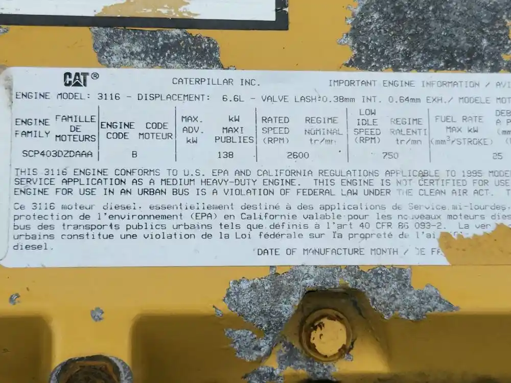 (Used) 1995 Caterpillar 3116, ENGINE ASSEMBLY- Family Number: SCP403DZDAAA, Displacement: 6.6L, Horsepower: 185, ARR/CPL 106-7875, ESN: 9GK40120, Part Number: 15962874, Reference images for condition,