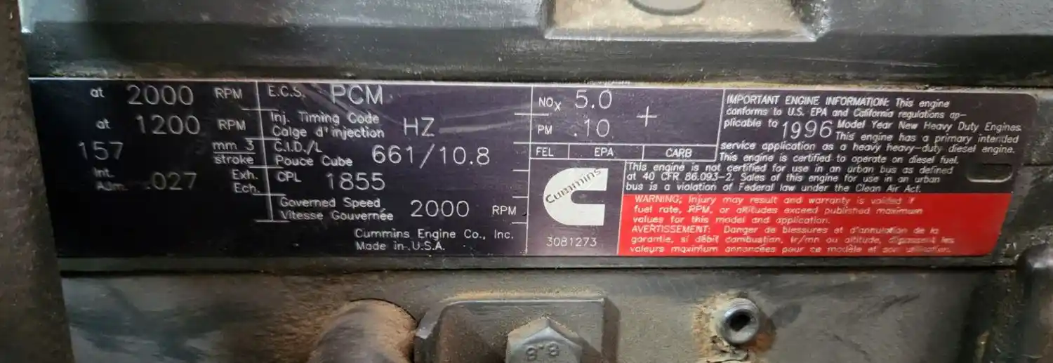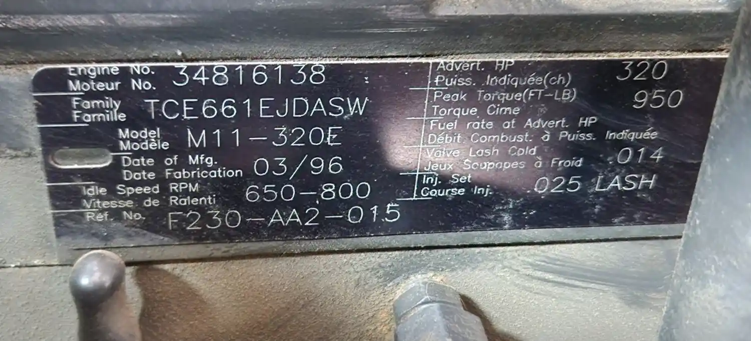(Used) 1996 Cummins M11-320E, ENGINE ASSEMBLY- Family Number: TCE661EJDASW, Displacement: 10.8L, Horsepower: 320, Ar.No./CPL: 1855, Serial Number: 34816138, Part Number: F230-AA2-015, E.C.S: PCM,