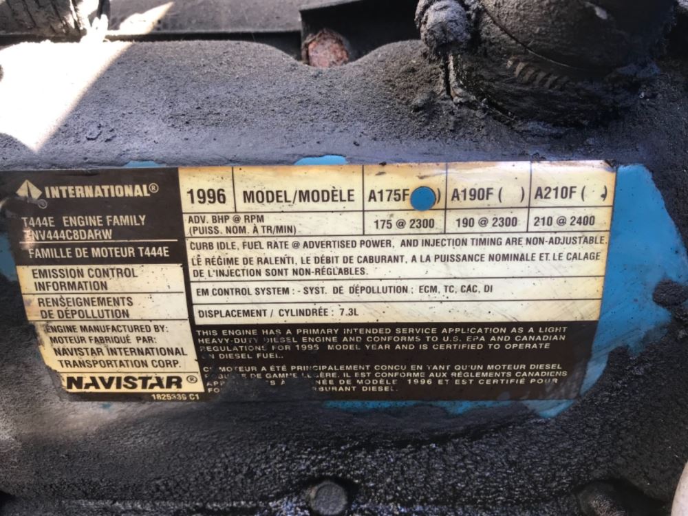 (USED) 1996 International T444E, Complete Engine Assembly. S/N-1825339C1 P/N-TNV444C8DARW HP-175 CPL-1825 ECS-ECM, TC, CAC, DI Model-A175F We ship Worldwide.