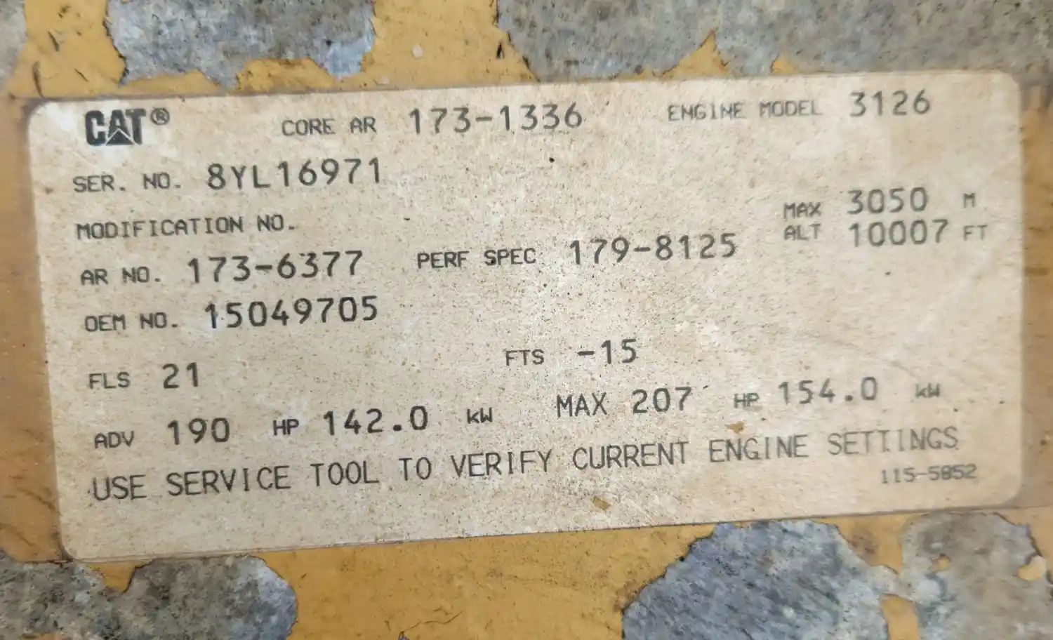 (Used) 1999 Caterpillar 3126, ENGINE ASSEMBLY- Family Number: XCPXH0442HSK, Displacement: 7.2L, Horsepower: 190, Ar.No./CPL: 173-6377, Serial Number: 8YL16971, Part Number: 15049705, ECS: EM, DI, TC, ECM, CAC,