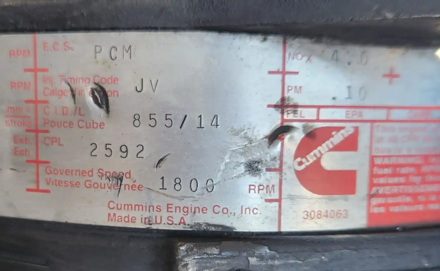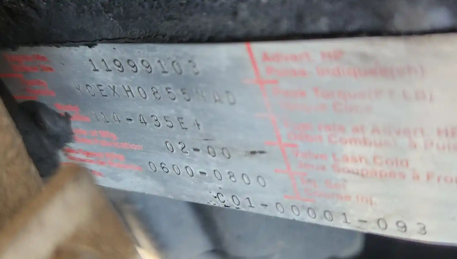 (Used) 2000 Cummins N14, ENGINE ASSEMBLY- Family Number: YCEXH0855NAD, Displacement: 14.0L, Horsepower: 435, Ar.No./CPL: 2592, Serial Number: 11999103, Part Number: C01-00001-093, ECS: PCM,