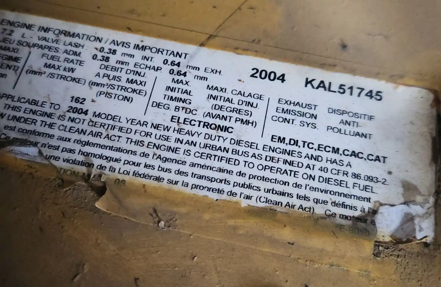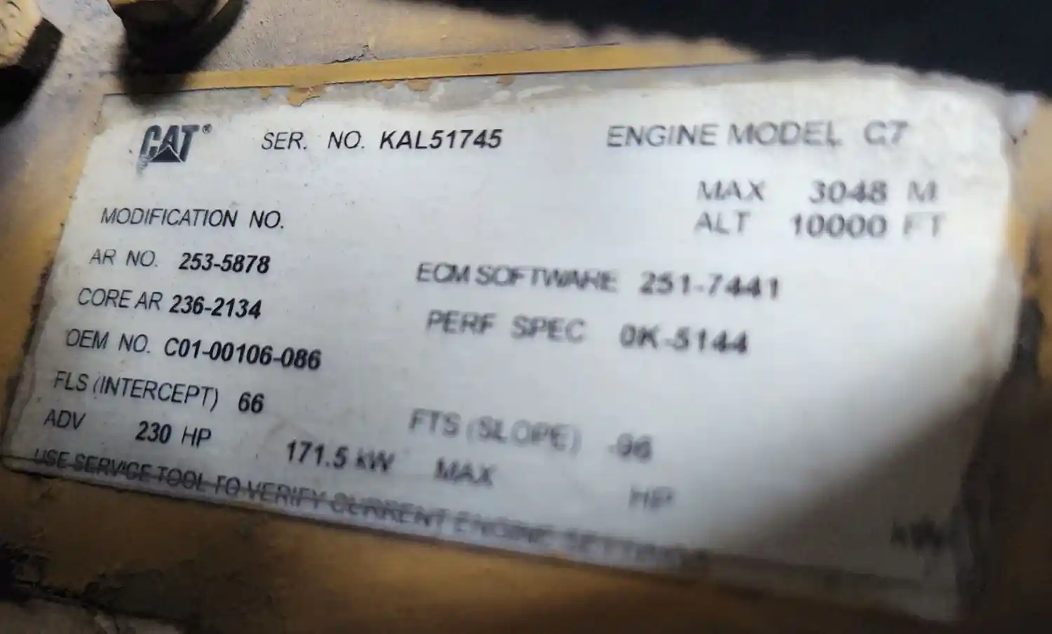 (Used) 2004 Caterpillar C7, ENGINE ASSEMBLY- Family Number: 4CPXH0442HBK, Displacement: 7.2L, Horsepower: 230, Ar.No./CPL: 253-5878, ESN: KAL51745, Part Number: C01-00106-086, E.C.S: EM, DI, TC, ECM, CAC, CAT, Reference images for condition. ,