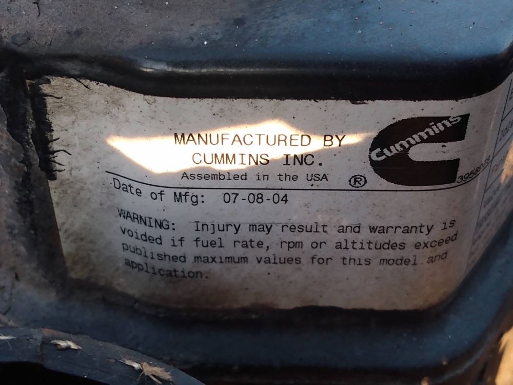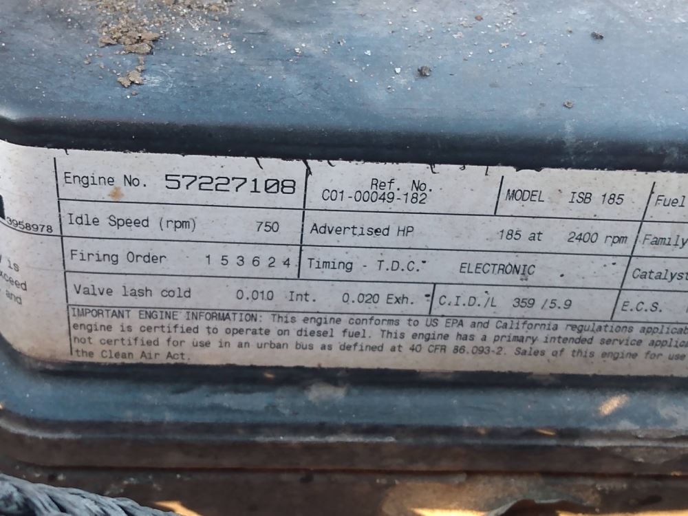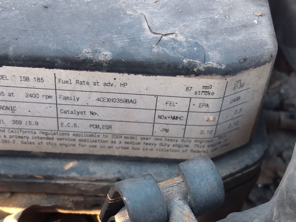 (Used) 2004 Cummins ISB, ENGINE ASSEMBLY- Family Number: 4CEXH0359BAG, Displacement: 5.9L, Horsepower: 185, Serial Number: 57227108, CPL: 8136, E.C.S.: PCM, EGR,