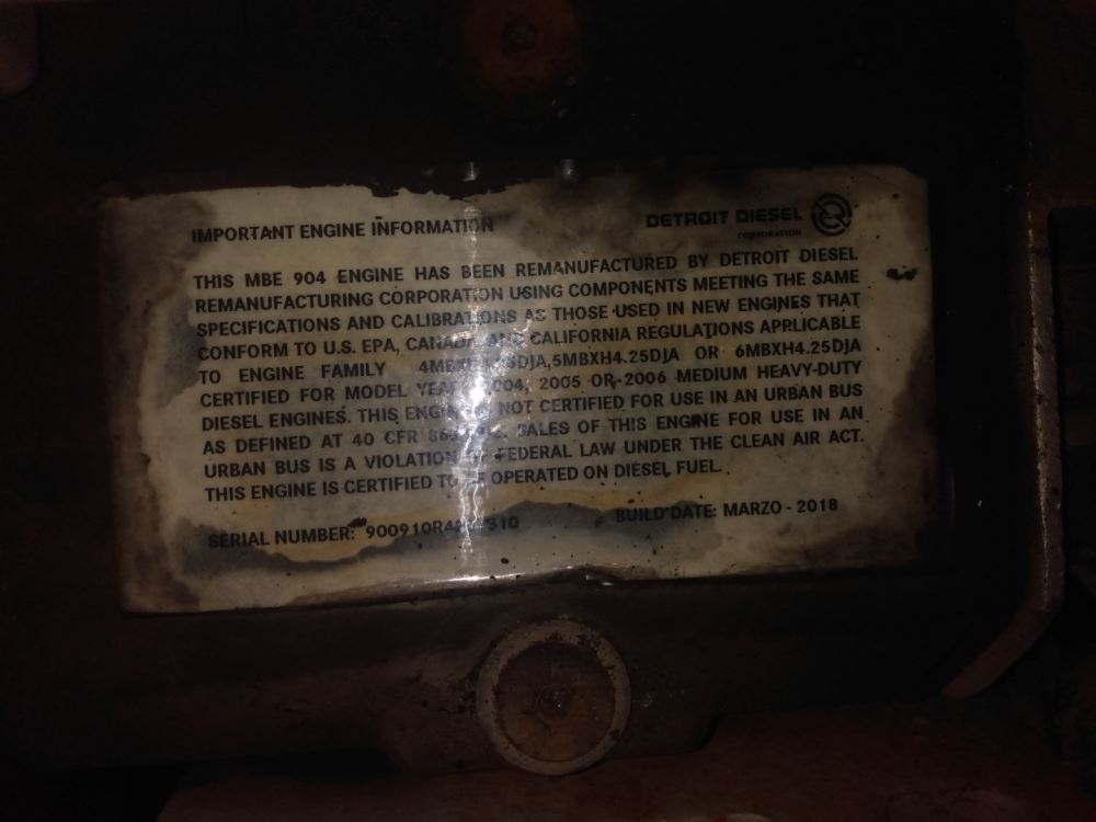 (Used) 2004 Mercedes MBE 904, ENGINE ASSEMBLY- Family Number: 6MBXH4.25DJA, Displacement: 4.25L, Serial Number: 900910R4207310,