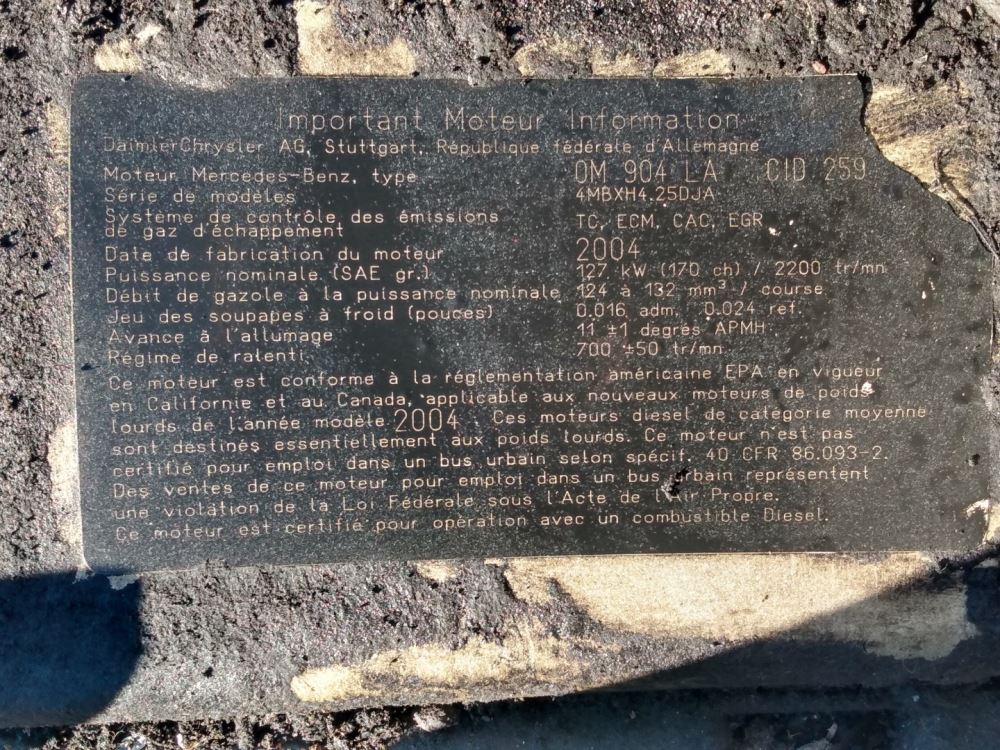 (Used) 2004 Mercedes OM904LA, ENGINE ASSEMBLY- Family Number: 4MBXH4.25DJA, Displacement: 4.25L, Horsepower: 170, E.C.S.: TC, ECM, CAC, EGR,
