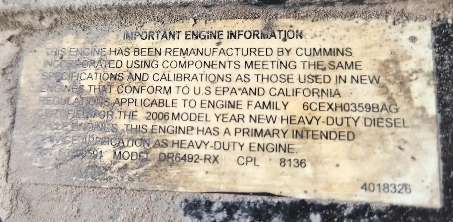 (Used) 2006 Cummins ISB 5.9, ENGINE ASSEMBLY- REMANUFACTURED BY CUMMINS- Family Number: 6CEXH0359BAG, Displacement: 5.9L, Horsepower: 185, Ar.No./CPL: 8136, Serial Number: 60293591, Part Number: 4018419, Reference images for condition