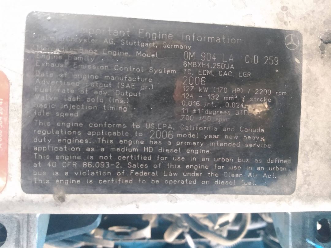 (Used) 2006 Mercedes MBE 904, ENGINE ASSEMBLY- Family Number: 6MBXH4.24DJA, Displacement: 4.25L, Horsepower: 170, E.C.S.: TC, ECM, CAC, EGR,