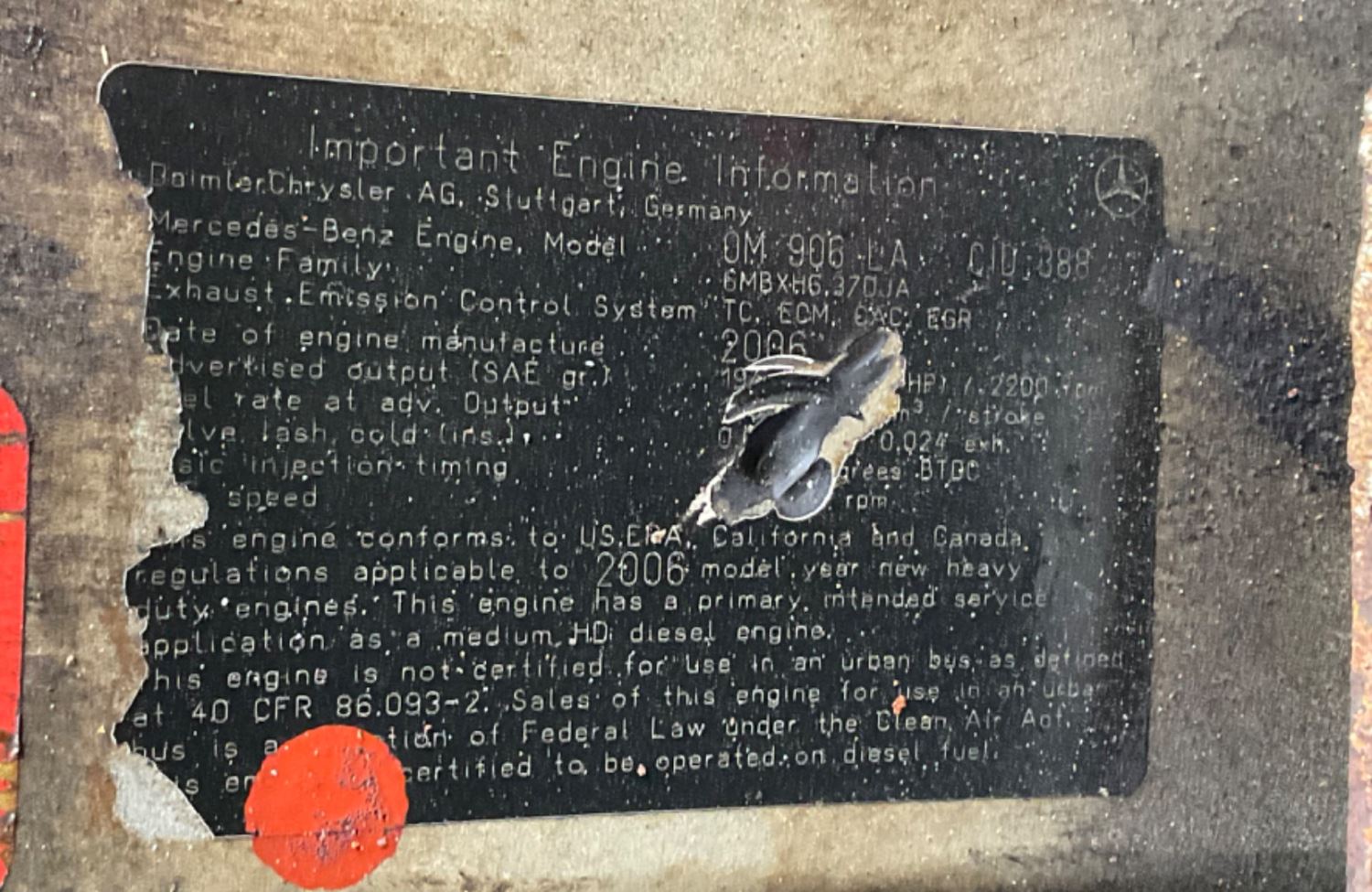 (Used) 2006 Mercedes OM 906 LA, ENGINE ASSEMBLY- Family Number: 6MBXH6.37DJA, Displacement: 6.37, Horsepower: 260, E.C.S.: TC, ECM, CAC, EGR,