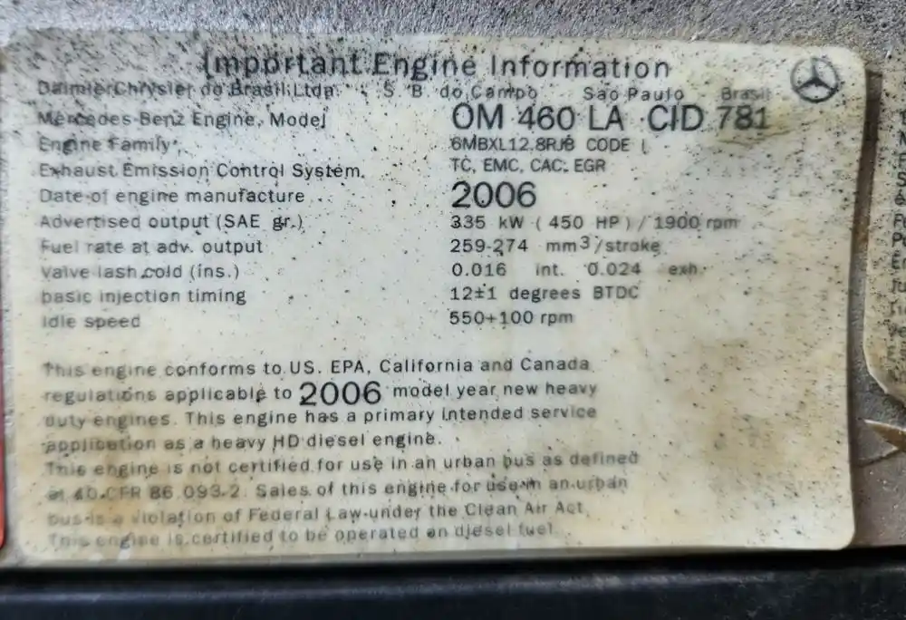 (Used) 2006 Mercedes OM460LA, ENGINE ASSEMBLY- Family Number: 6MBXL12.8RJB, Displacement: 12.8L, Horsepower: 450, Serial Number: 0460858716, Part Number: C01-00082-370, E.C.S: TC, EMC, CAC, EGR,