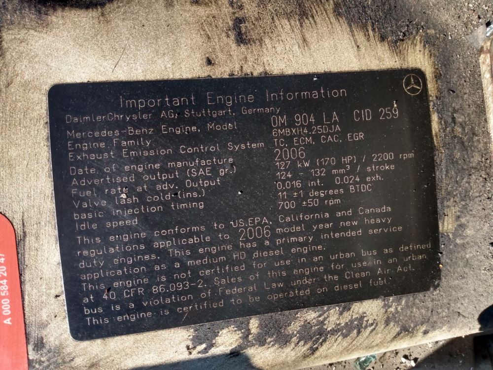 (Used) 2006 Mercedes OM904LA, ENGINE ASSEMBLY- Family Number: 6MBXH4.25DJA, Displacement: 4.25L, Horsepower: 170, E.C.S.: TC, ECM, CAC, EGR,