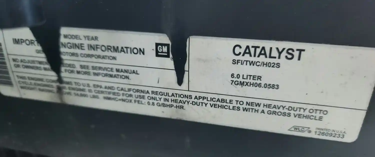 (Used) 2007 GM/Chev (HD) 6.0L, ENGINE ASSEMBLY- Family Number: 7GMXH06.0583, Displacement: 6.0L, Horsepower: 300, ECS: SFI, TWC, H02S, Fuel: Gasoline, Reference images for condition