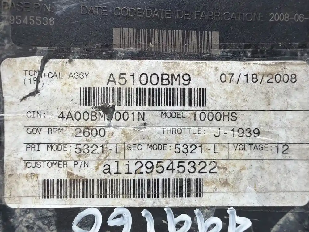 (Used) 2008 Allison 1000HS , TRANSMISSION ECM- Part Number: 29545536, Serial Number: BK5536N1816904BC, 12 Volts A5100BM9, CIN: 4A00BM9001N, GOV RPM: 2600, THROTTLE: J--1939, PRI MODE: 5321- L, SEC MODE: 5321- L, E11, 032849, 10R022849, Supplier Number: ATA5101, Plug Pins: 80 Pins Plug Rectangular, Reference images for condition. ,