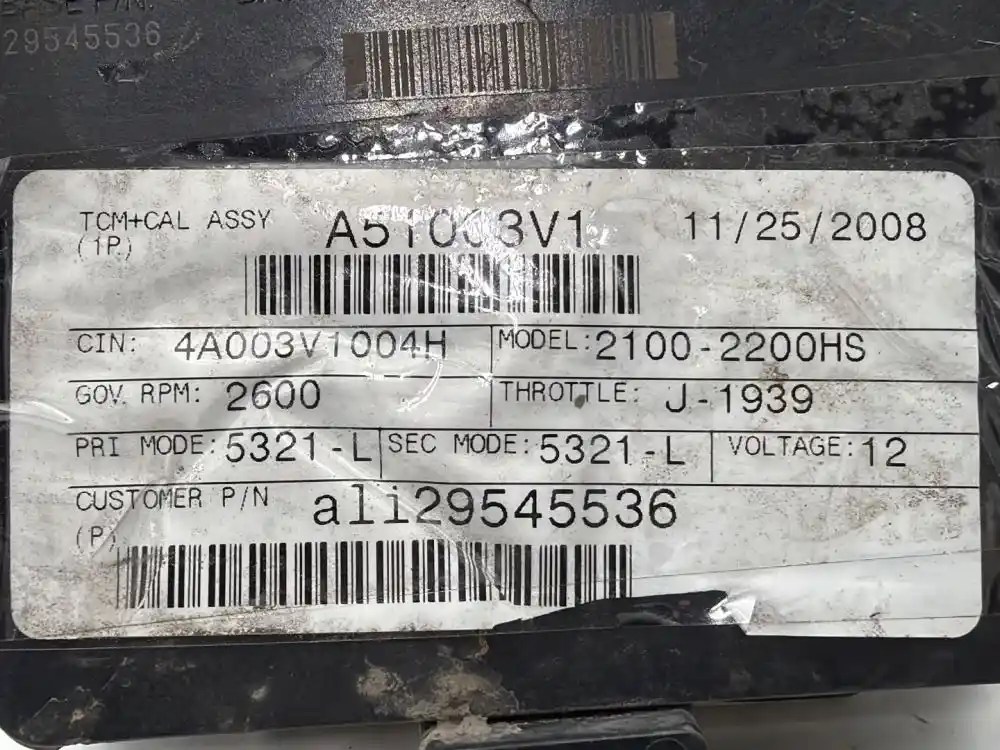(Used) 2008 Allison 2100-2200HS (AT), TRANSMISSION ECM- Part Number: 29545536, Serial Number: BK5536N1811502A3, 12 Volts A51003V1, CIN: 4A003V1004H, GOV RPM: 2600, THROTTLE: J--1939, PRI MODE: 5321- L, SEC MODE: 5321- L, E11, 032849, 10R022849, Supplier Number: ATA5101, Plug Pins: 80 Pins Plug Rectangular, Reference images for condition. ,