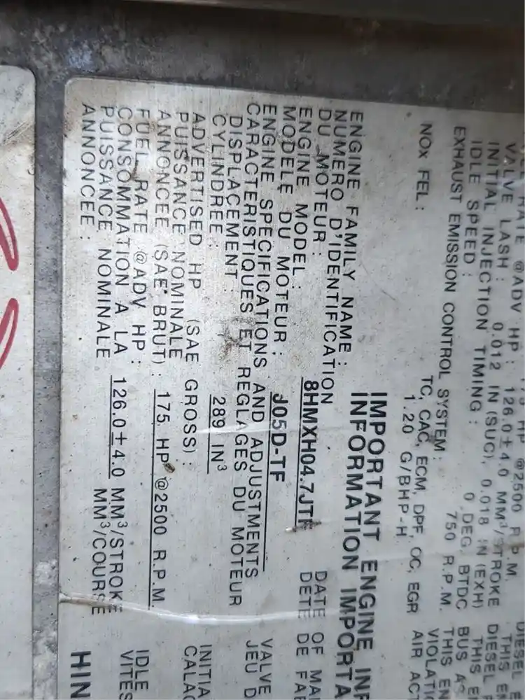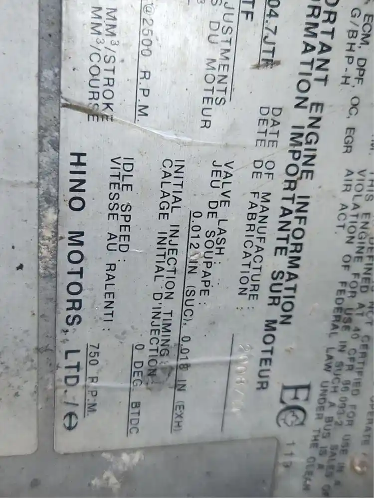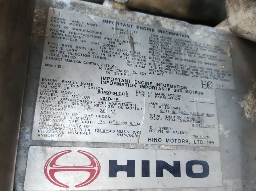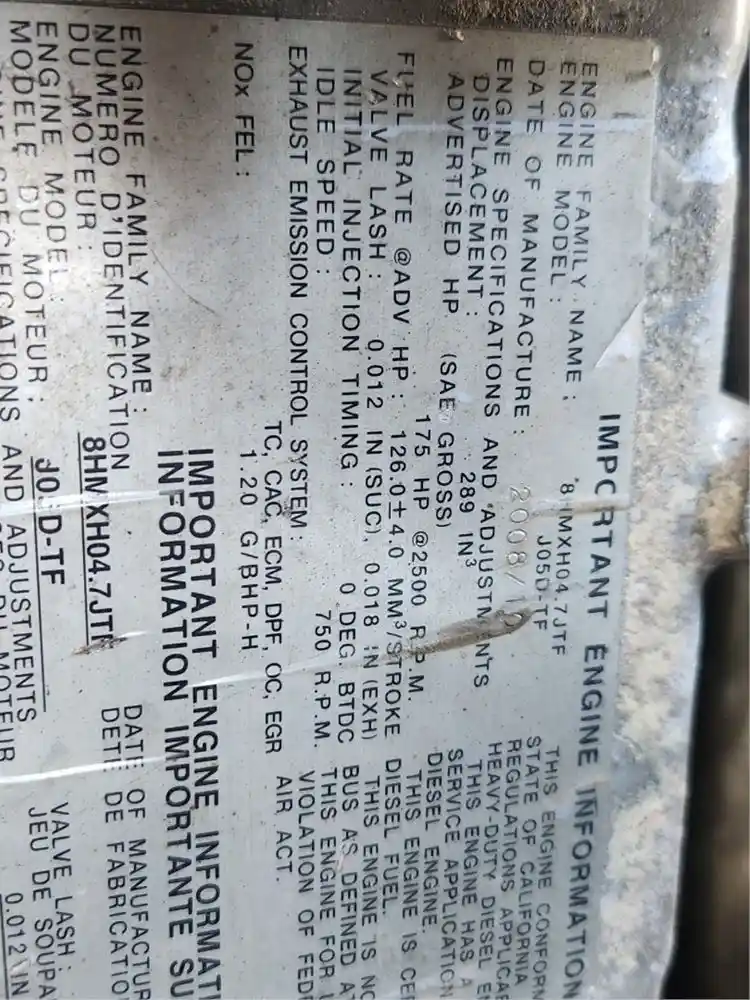 (Used) 2008 Hino J05D-TF, ENGINE ASSEMBLY- Family Number: 8HMXH04.7JTF, Displacement: 4.7L (289), Horsepower: 175, E.C.S.: TC, CAC, ECM, DPF, OC, EGR,