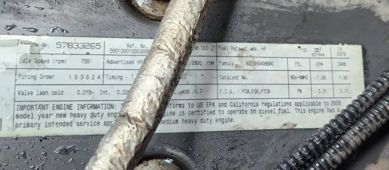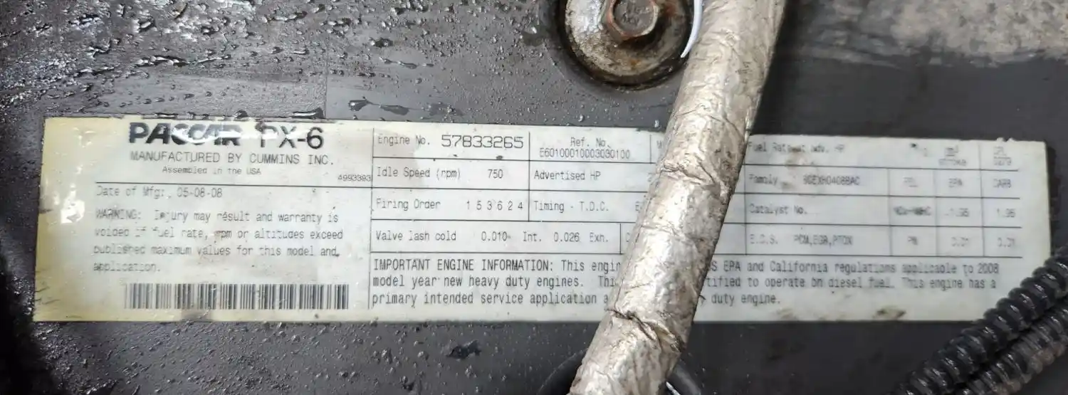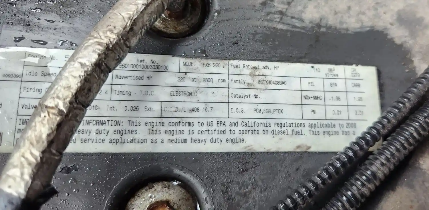(Used) 2008 PACCAR PX-6 ENGINE ASSEMBLY- Family Number: BCEXH0408BAC, Displacement: 6.7L, Horsepower: 220, Serial Number: 57833265, Part Number: E60100010003030100, CPL: 0279, E.C.S.: PCM, EGR, PTOX, Reference images for condition. ,