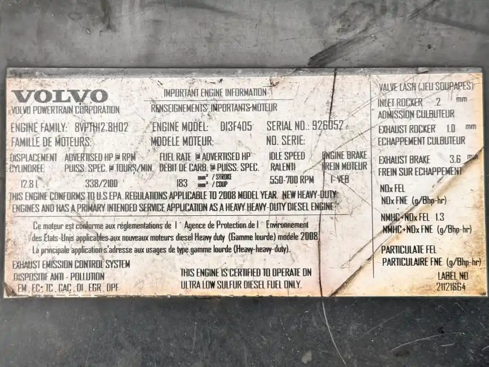 (Used) 2008 Volvo D13, ENGINE ASSEMBLY- Family Number: 8VPTH12.8H02, Displacement: 12.8L, Horsepower: 338, Part Number: 21121864, E.S.N.: 926052, E.C.S: EM, EC, TC, CAC, DI, EGR, DPF, ,