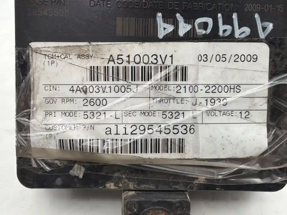 (Used) 2009 Allison 2200HS, TRANSMISSION ECM- Part Number: 29545536, Serial Number: BK536N190120709, TCM Model: A51, Supplier P/N: ATA5101, E11 10R-042849, 032849, 12V\24V, TCM+CAL ASSY: A51003V1, GOV RPM: 2600, THROTTLE: J-1939, PRI MODE: 5321-L, SEC MODE: 5321-L, CIN:4A003V1005J, 1 Rectangular Plug with 80 Pins, Reference images for condition,