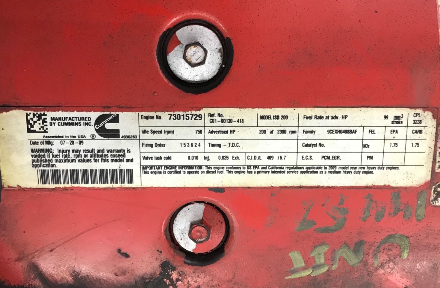 - (USED) 2009 CUMMINS ISB 200 Complete Engine. Engine Serial # 73015729 Engine Family # 9CEXH0408BAF Engine HP: 200 ADV Displacement: 6.7L / 409 CID CPL/AR: 3238 E.C.S.: PCM, EGR. Tested and Runs GREAT!!! To find out more about this engine, give us a call.