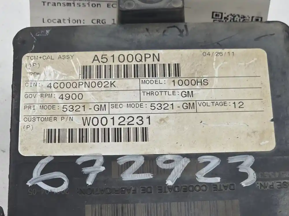 (Used) 2011 Allison 1000HS (AT), TRANSMISSION ECM- ECM Model: A51, Part Number: 29545536, Serial Number: BK5536N110940092 , 12 Volts A5100QPN, CIN: 4C00QPN002K, Transmission Model: 1000HS, GOV RPM: 4900 THROTTLE: GM PRI MODE: 5321- GM, SEC MODE: 5321- GM, E11, 032849 10R022849, SU Number: ATA5101, Base Part Number: 29545536, Plug Pins: 80 Pins Plug Rectangular, Reference images for condition. ,