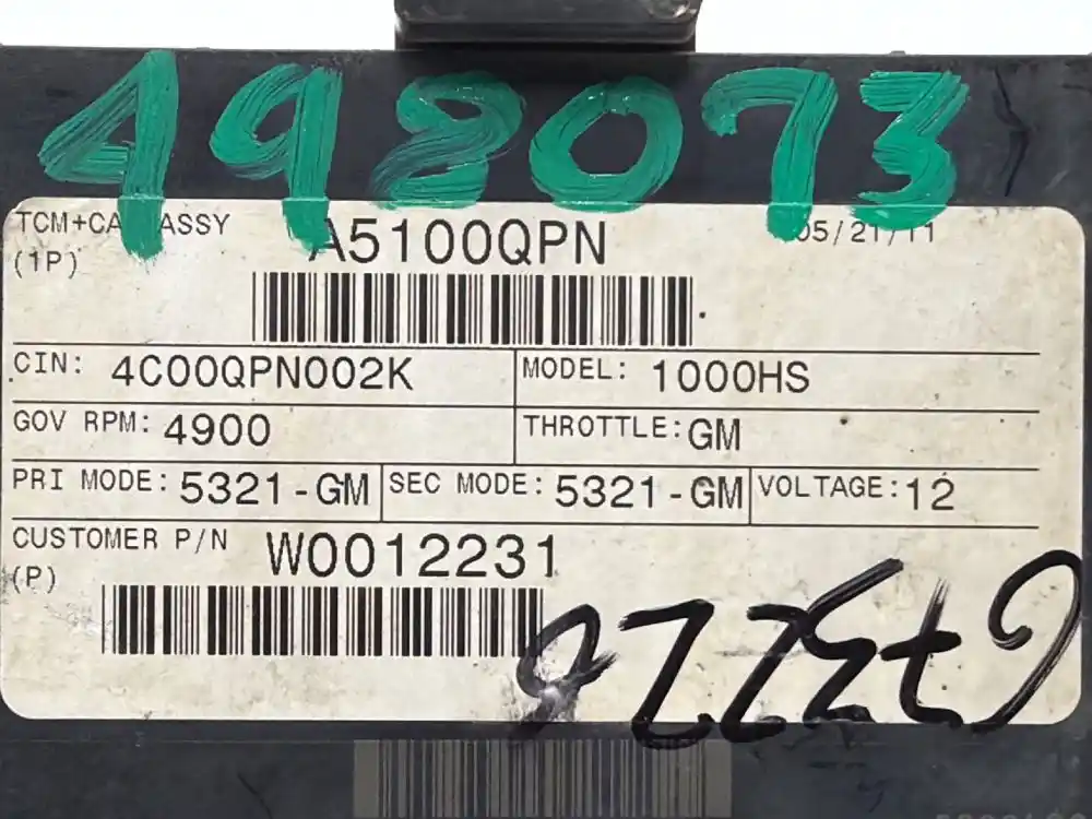 (Used) 2011 Allison 2200HS , TRANSMISSION ECM- Part Number: 29545536, Serial Number: BK5536N111210042, 12 Volts, A5100QPN, CIN: 4C00QQPN002K, GOV RPM: 4900, THROTTLE: GM, PRI MODE: 5321-GM, SEC MODE: 5321-GM, CUSTOMER P/N: W0012231, E11, 032849, 10R022849, Supplier Number: ATA5101, Plug Pins: 80 Pins Plug Rectangular, Reference images for condition. ,