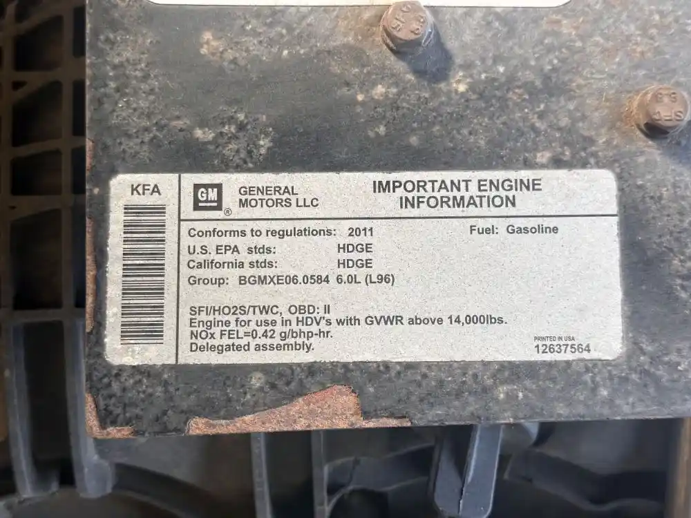 (Used) 2011 GM/Chev (HD) 6.0L, ENGINE ASSEMBLY- Family Number: BGMXE06.0584, Displacement: 6.0L, Horsepower: 360, Part Number: 12637564, E.S.N.: N/A, E.C.S: SFI, HO2S, TWC, Fuel: Gasoline, ,