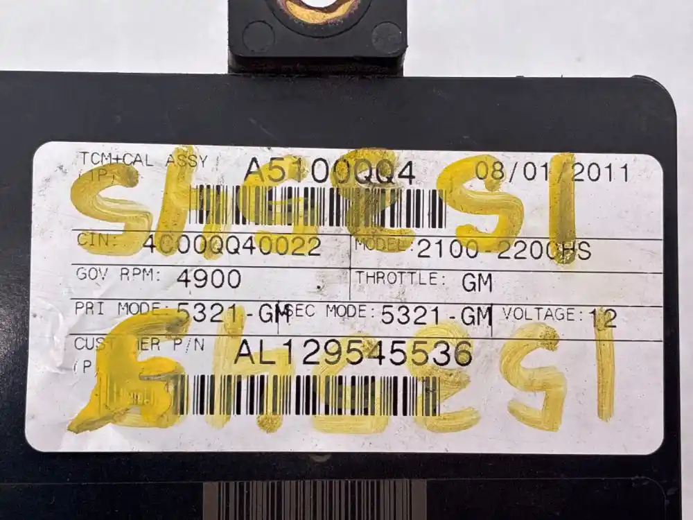 (Used) 2012 Allison 2100-2200HS, TRANSMISSION ECM- Part Number: 29545536, Serial Number: BK5536N11700A27, A5100QQ4, CIN: 4C00QQ40022, GOV RPM: 4900, THROTTLE: GM, PRI MODE: 5321-GM, SEC MODE: 5321-GM, 12 Volts, Customer P/N: AL129545536, E11, 032849, 10R022849, Supplier Number: ATA5101, MODEL: A51, Plug Pins: 80 Pins Plug Rectangular, Reference images for condition. ,