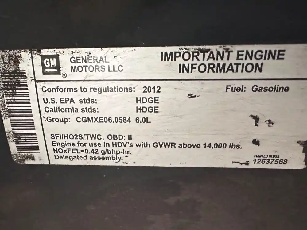 (Used) 2012 GM/Chev (HD) 6.0L, ENGINE ASSEMBLY- Family Number: CGMXE06.0584, Displacement: 6.0L, Horsepower: 360, Part Number: 12637568, E.S.N.: TBD, E.C.S: SFI, HO2S, TWC, Fuel: Gasoline, Reference images for condition. ,