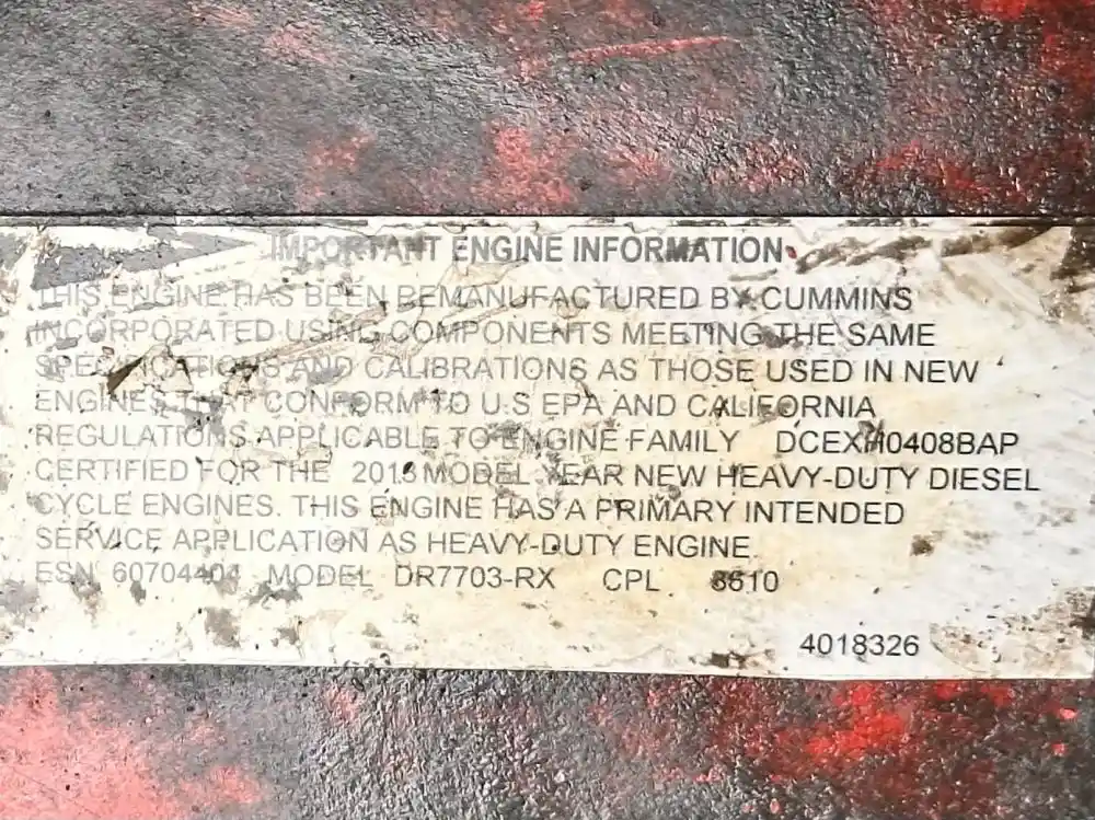 (Used) 2013 Cummins ISB, ENGINE ASSEMBLY- REMANUFACTURED!! Family Number: DCEXH0408BAP, Displacement: 6.7L, Horsepower: 250, Ar.No./CPL: 3610, Serial Number: 60704404, ,