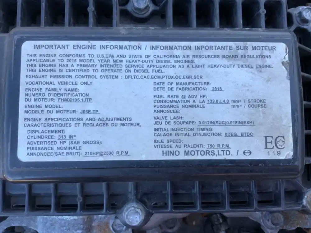 (Used) 2015 HINO J05E ENGINE ASSEMBLY- Horsepower: 210 Displacement: N/A Family Number: FHMXH05.1JTP