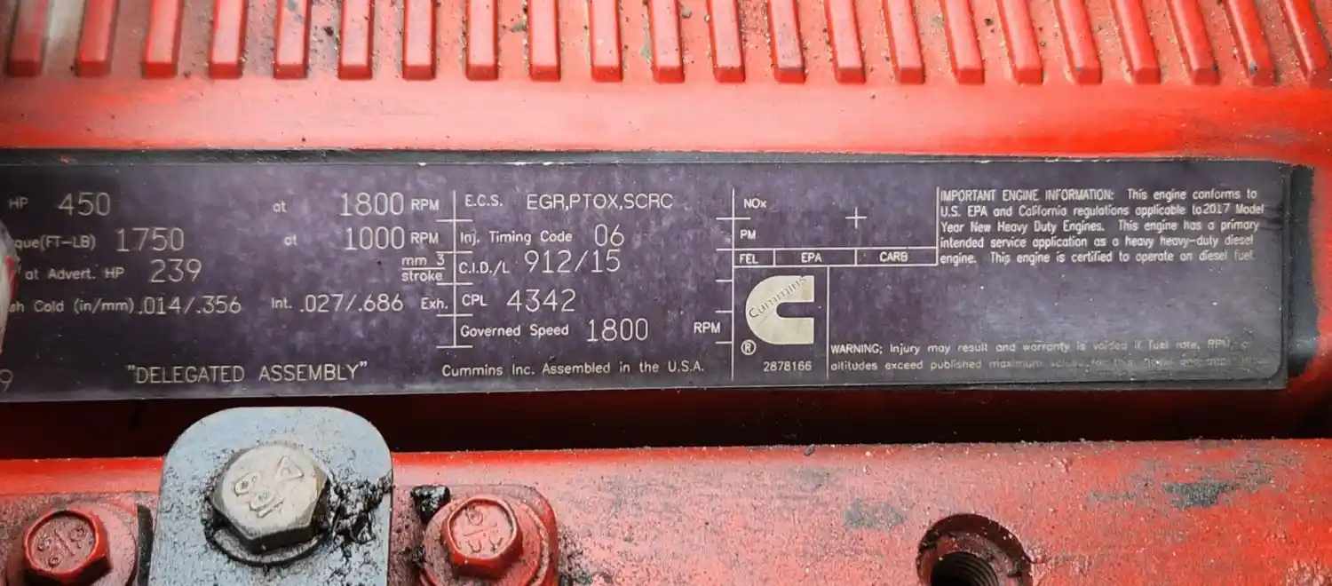 (Used) 2017 Cummins X15 450SA, ENGINE ASSEMBLY- Family Number: HCEXH0912XAW, Displacement: 14.9L, Horsepower: 450, Ar.No./CPL: 4342, Serial Number: 80002818, Part Number: E6SPGR767Q8NC67A79, E.C.S: EGR, PTOX, SCRC,