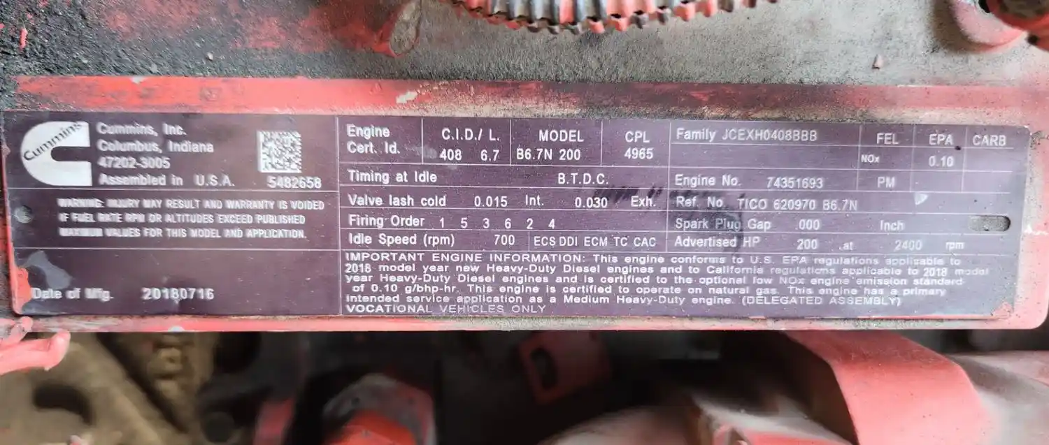 (Used) 2018 Cummins B6.7N 200, ENGINE ASSEMBLY- Family Number: JCEXH0408BBB, Displacement: 6.7L, Horsepower: 200, Ar.No./CPL: 4965, Serial Number: 74351693, Part Number: 620970, E.C.S: DDI, ECM, TC, CAC, Fuel: CNG,