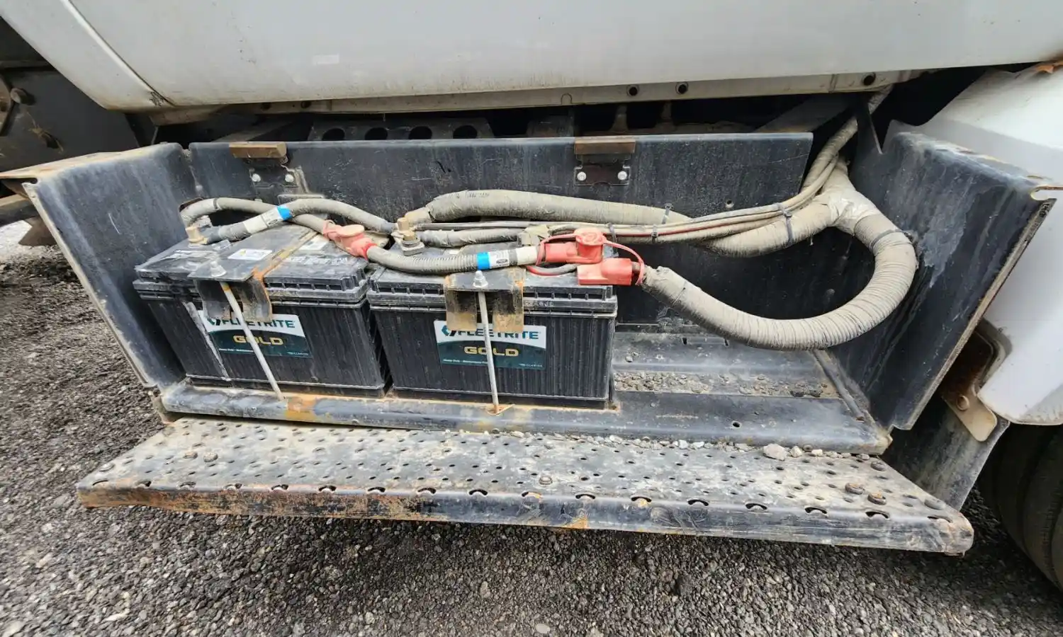 (Used) 2018 Ford F-750, BATTERY BOX- Side: Passenger Right Side, Capacity: 3 Batteries, Material: Steel, Dimensions: L=46", H=17.5", W=10", Damage To The Step, Reference images for condition,