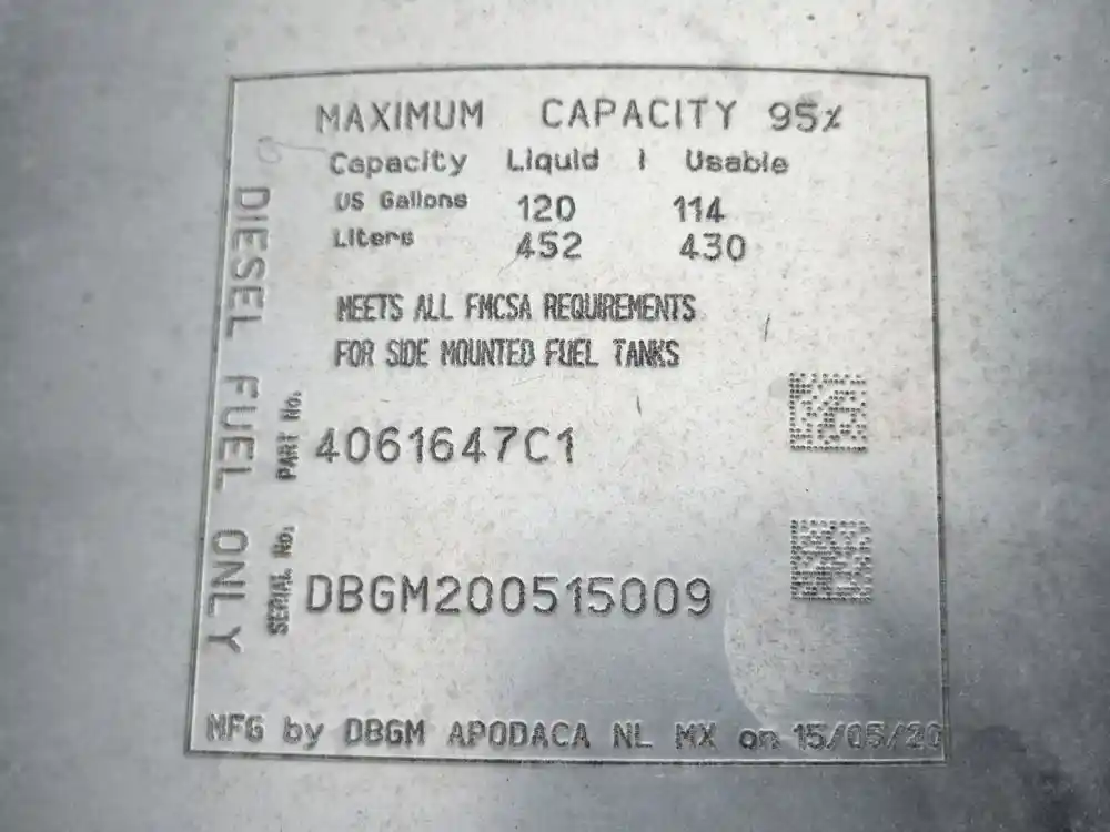 (Used) 2019 International LT625, FUEL TANK- Part Number: 4061647C1, Side: Passenger Right Side, Capacity: 120 Gallons, Material: Aluminum, Shape: Cylinder, Dimensions: L=54.5", D=26", Reference images for condition,