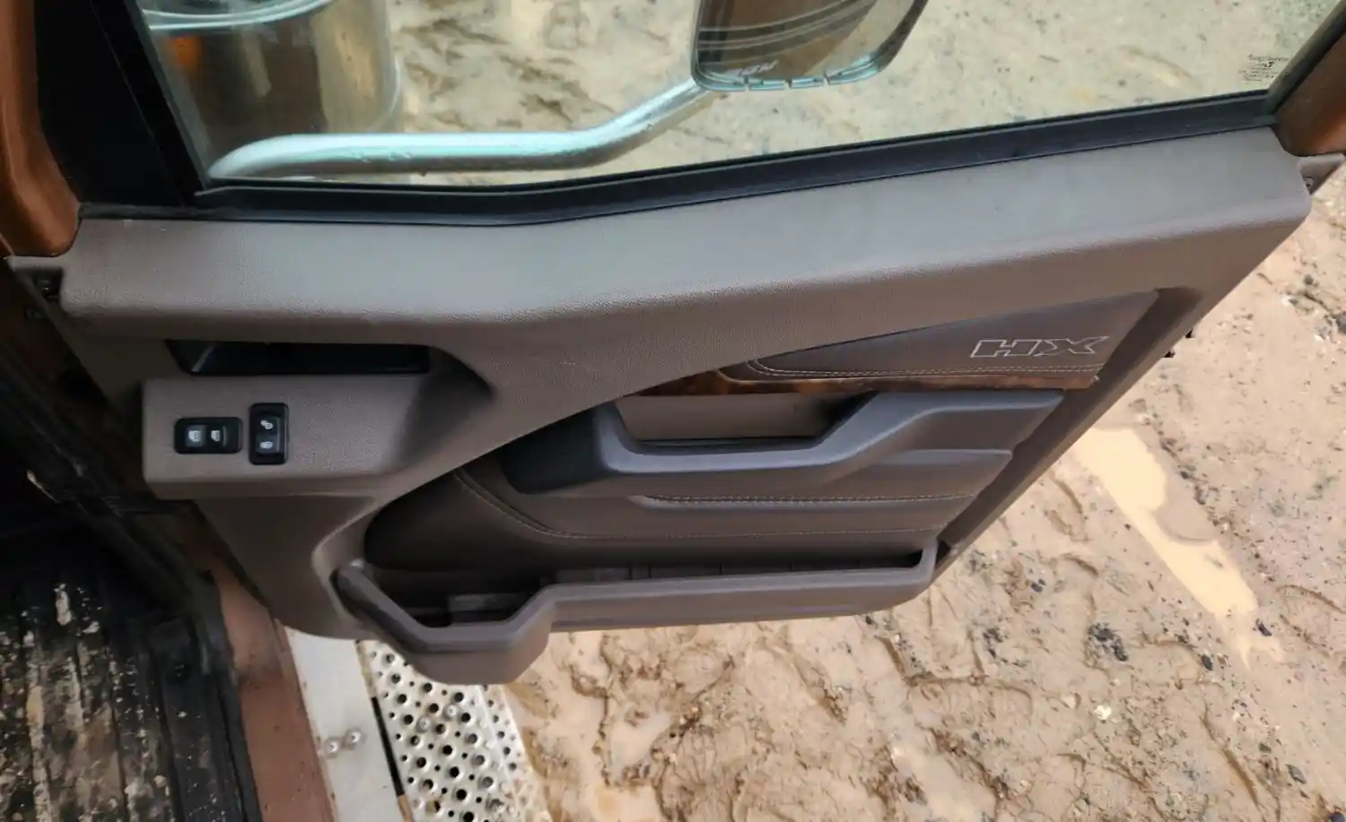 (Used) 2020 International HX520, INTERIOR DOOR PANEL- Side: Passenger Right Side, Color: Brown, Type: Power, Material: Plastic with Vinyl, Minor Damage Reference images for condition,
