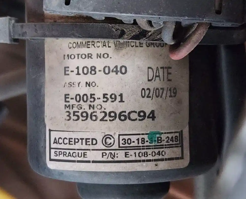 (Used) 2020 International HX520, WIPER MOTOR- Part Number: E-108-040, Asy.No.: E-005-591, MFG.No.: 3596296C94, Location: Front The Cab, Make: Sprague, Includes: Wiper Linkage, Reference images for condition,
