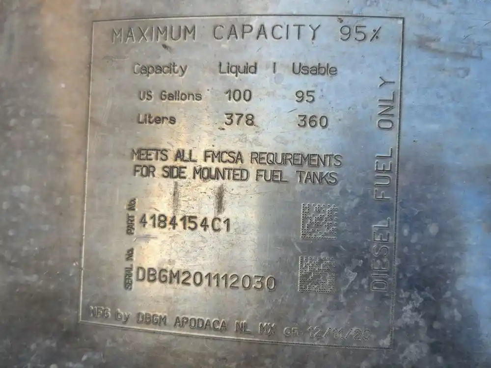 (Used) 2021 International LT625, FUEL TANK- Part Number: 4184154C1, Serial Number: DBGM201112030, Side: Passenger Right Side, Capacity: 100 Gallons, Material: Aluminum, Shape: Cylinder, Dimensions: L=45.5", D=26.5",