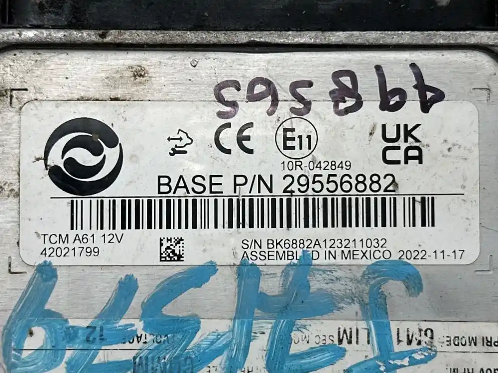 (Used) 2022 Allison 2500PTS, TRANSMISSION ECM- Part Number: 29556882, Serial Number: BK6882A123211032, E11, 10R-042849, TCM A61 12V, 42021799, 61BR0QU2, CIN: B19400303F00C, GOV RPM: 1700, THROTTLE: COMM, PRI MODE: 6M1L1M, SEC MODE: --, Voltage: 12, 1 Rectangular Plug with 80 Pins, Reference images for condition,
