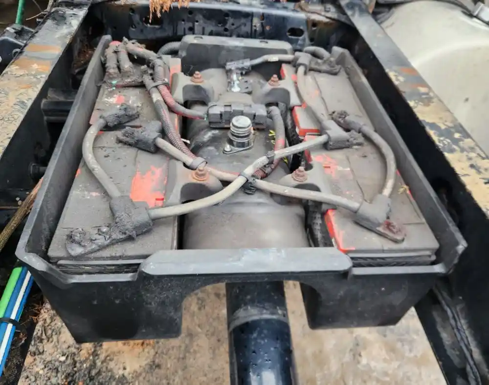 (Used) 2022 Freightliner Cascadia 126, BATTERY BOX- Side: Central Frame behind Cab, Capacity: 4 Batteries, Material: Plastic, Dimensions: L=30 ?", W=25 ½", Reference images for condition,