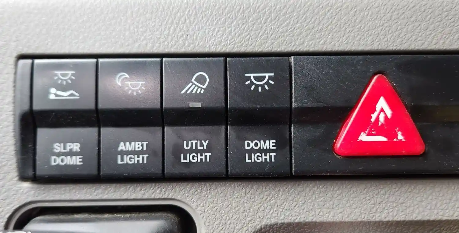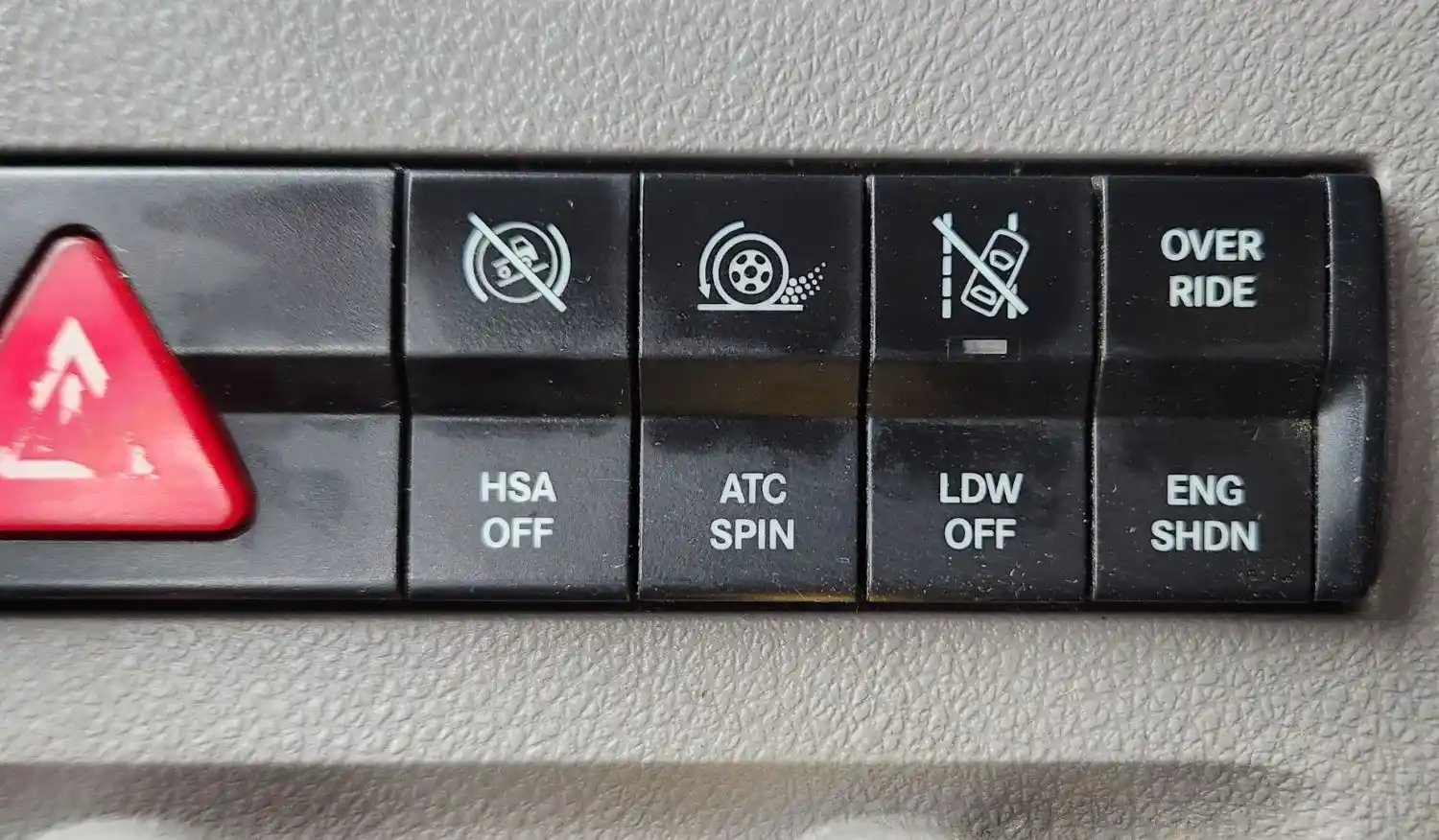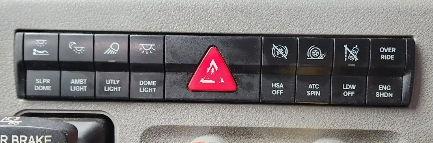 (Used) 2022 Freightliner Cascadia 126, MISCELLANEOUS DASH SWITCHES- Controls: Sleeper Dome, Ambt Light, Utly Light, Dome Light, Hazard Lights, HSA Off, Atc Spin, Ldw Off, Override Eng Shdn, Material: Plastic, Reference images for condition,
