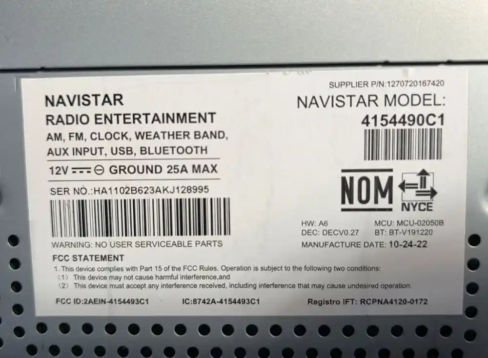 (Used) 2024 International RH613, RADIO- Part Number: 1270720167420, Type: Navistar/International, Plays: AM/FM, CLOCK, WEATHER BAND, AUX INPUT, USB, BLUETOOTH, Reference images for condition,