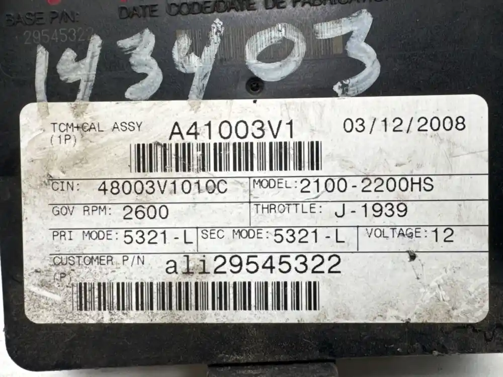 (Used) 2008 Allison 2200HS, TRANSMISSION ECM- Part Number: 29545322, Serial Number: BK5322N180319V9M, CIN: 48003V1010C, GOV RPM: 2600, THROTTLE: J-1939 PRI MODE: 5321-L SEC MODE: 5321-L VOLTAGE: 12 TCM Model: A41, E11 022849 10 R 022849 SU Part Number: ATA4103 Base Part Number: 29545322, 1 Rectangular Plug with 80 Pins, Reference images for condition,