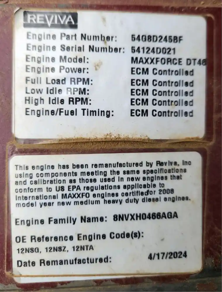 (Used) 2008 International DT466, ENGINE ASSEMBLY- REMANUFACTURED!! Date Remanufactured: 4/17/2024, Family Number: 8NVXH0466AGA, Displacement: 7.6L, Horsepower: 210, Serial Number: 54124D021, Part Number: 54G8D245BF,