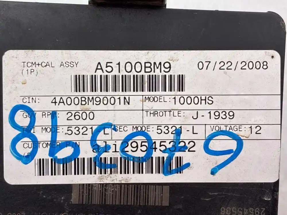 (Used) 2009 Allison 1000HS , TRANSMISSION ECM- Part Number: 29545536, Serial Number: BK5536N181590855, A5100BM9, CIN: 4A00BM9001N, GOV RPM: 2600, THROTTLE: J-1939, PRI MODE: 5321-L, SEC MODE: 5321-L, Customer P/N: ali29545322, 12V, E11, 032849, 10R022849, Supplier Number: ATA5101, MODEL: A51, Plug Pins: 80 Pins Plug Rectangular, Reference images for condition. ,