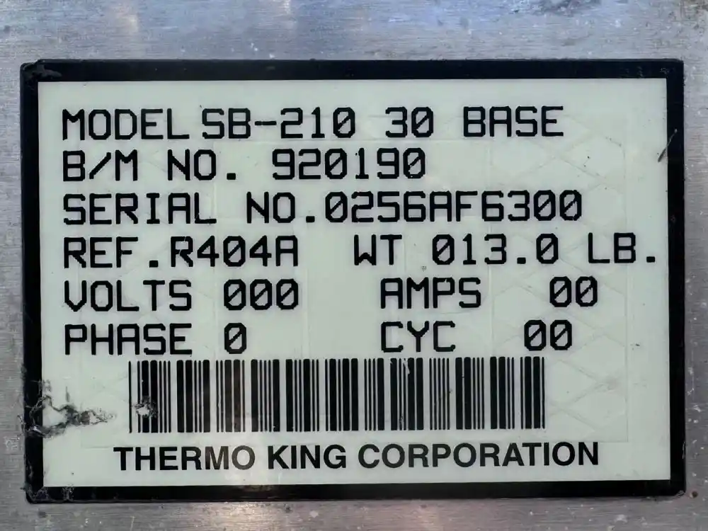 (Used) 2009 Thermo King SB-210, REEFER UNIT- Serial Number: 0256AF6300, B/M Number: 920190, Refrigerant: R404A, Hours: ??? Engine Information- Engine: Ingersoll-Rand, Model: TK486V, Serial Number: V83000, Family Number: : 9YDXL2.09K4N / YD2200DNMDEC, Displacement: 2.091L, Minor cosmetic damage, Reference images for condition. ,