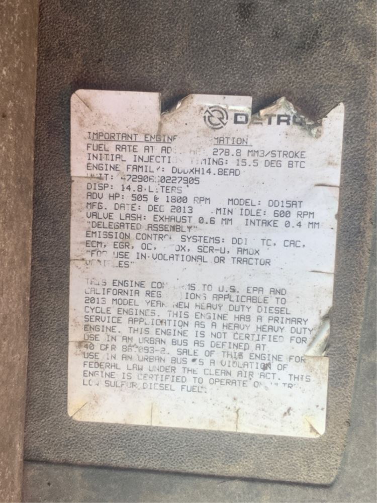 (Used) 2013 Detroit DD15, ENGINE ASSEMBLY- Family Number: DDDXH14.8EAD, Displacement: 14.8L, Horsepower: 505, Serial Number: 472906S0227905, E.C.S.: DDI, TC, CAC, ECM, EGR, OC, PTOX, SCR-U, AMOX,