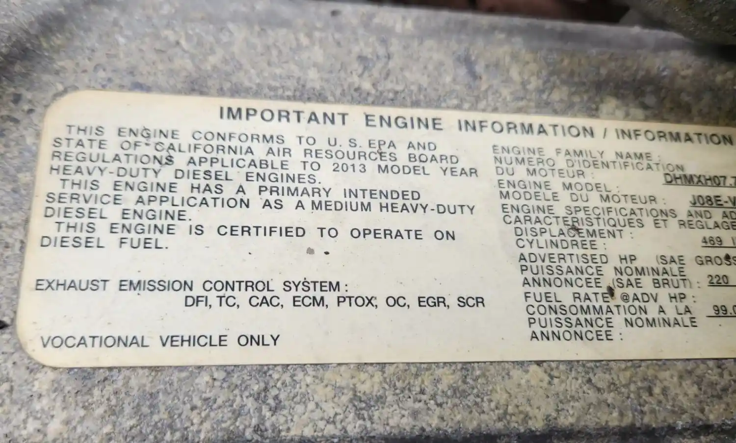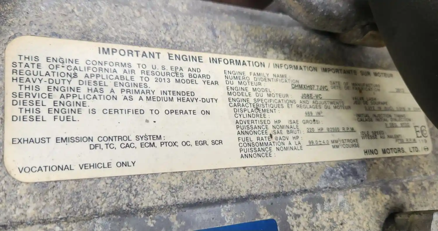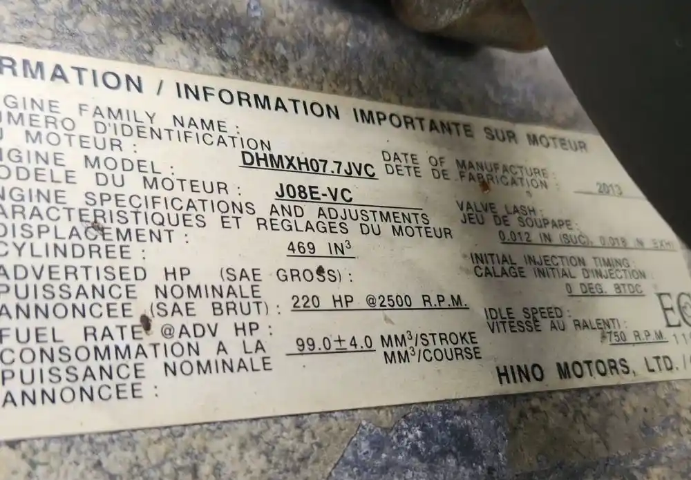 (Used) 2013 Hino J08E-VC, ENGINE ASSEMBLY- Runs - HIGH MILES Selling as Core no Warranty Family Number: DHMXH07.7JVC, Displacement: 7.6L, Horsepower: 220, Serial Number: TBD, E.C.S: DFI, TC, CAC, ECM, PTOX, OC, EGR, SCR,