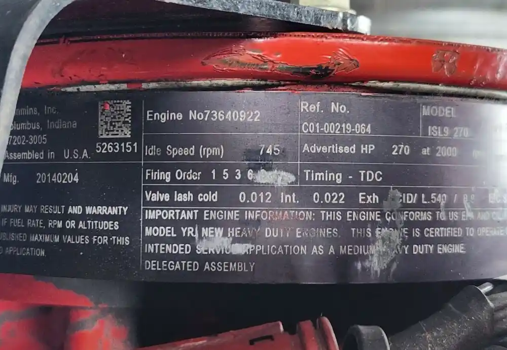 (Used) 2014 Cummins ISL9 270, ENGINE ASSEMBLY- Family Number: ECEXH0540LAV, Displacement: 8.9L, Horsepower: 270, Ar.No./CPL: 3664, Serial Number: 73640922, Part Number: C01-00219-064, E.C.S: EGR, PTOX, SCRC,