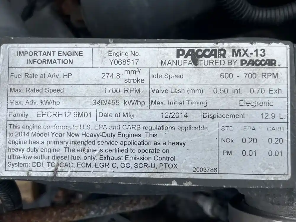 (Used) 2014 PACCAR MX13, ENGINE ASSEMBLY- Family Number: EPCRH12.9M01, Displacement: 12.9L, Horsepower: 455, Serial Number: Y068517, E.C.S.: DDI, TC, CAC, ECM, EGR-C, OC, SCR-U, PTOX, Reference images for condition, ,